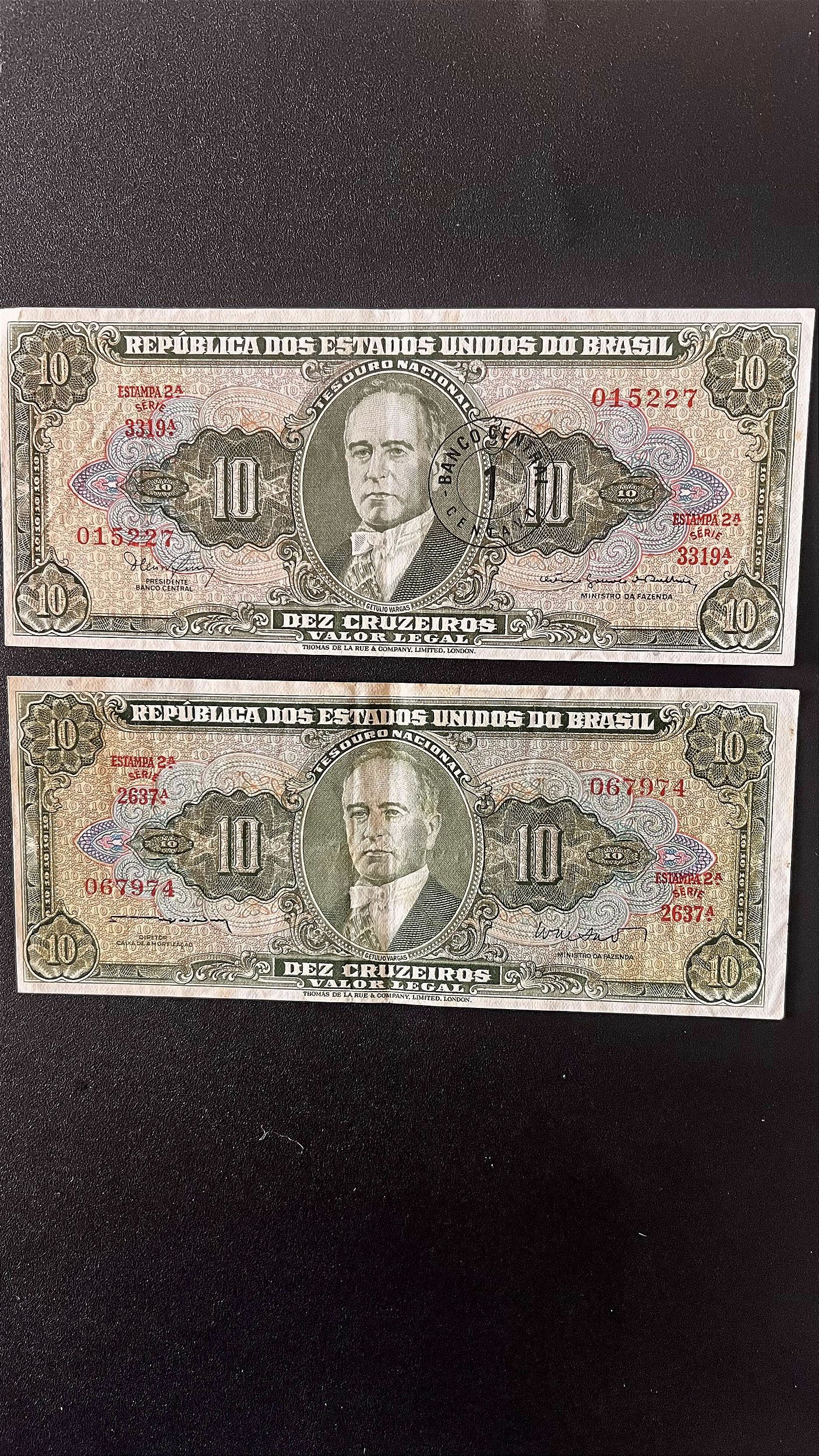 01 Cédulas do Brasil - Dez Cruzeiros - Dez Cruzeiros com carimbo de 1 Centavo - Getulio Vargas - Mbc - ref.502