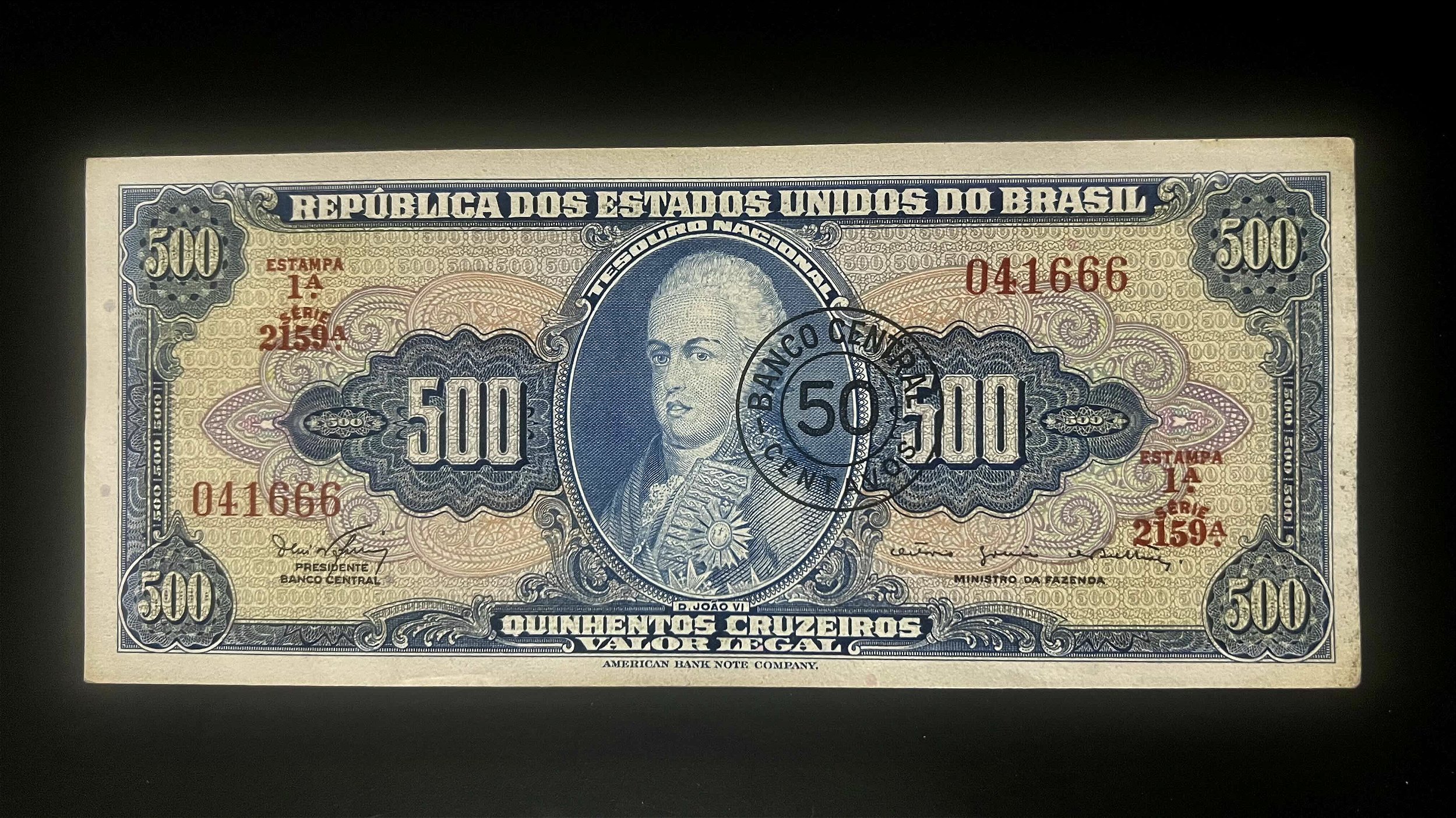 Cédula do Brasil - Quinhentos Cruzeiros - Dom João VI - Carimbo 50 Centavos - sob - ref.941