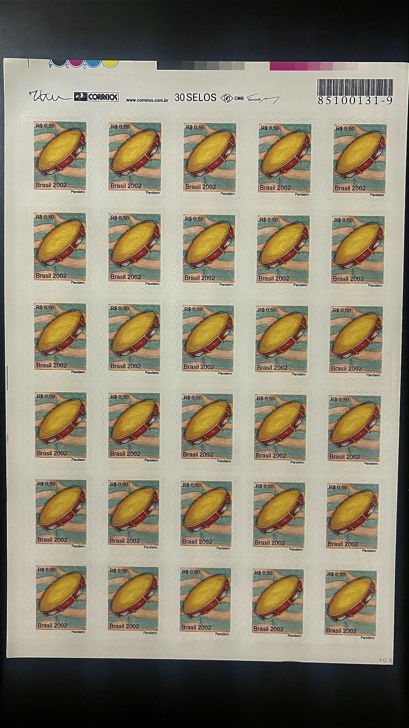 Folha Completa de 30 Selos Regulares do Brasil - Pandeiro - Adesivos - 2002 - Mint - ref.1042